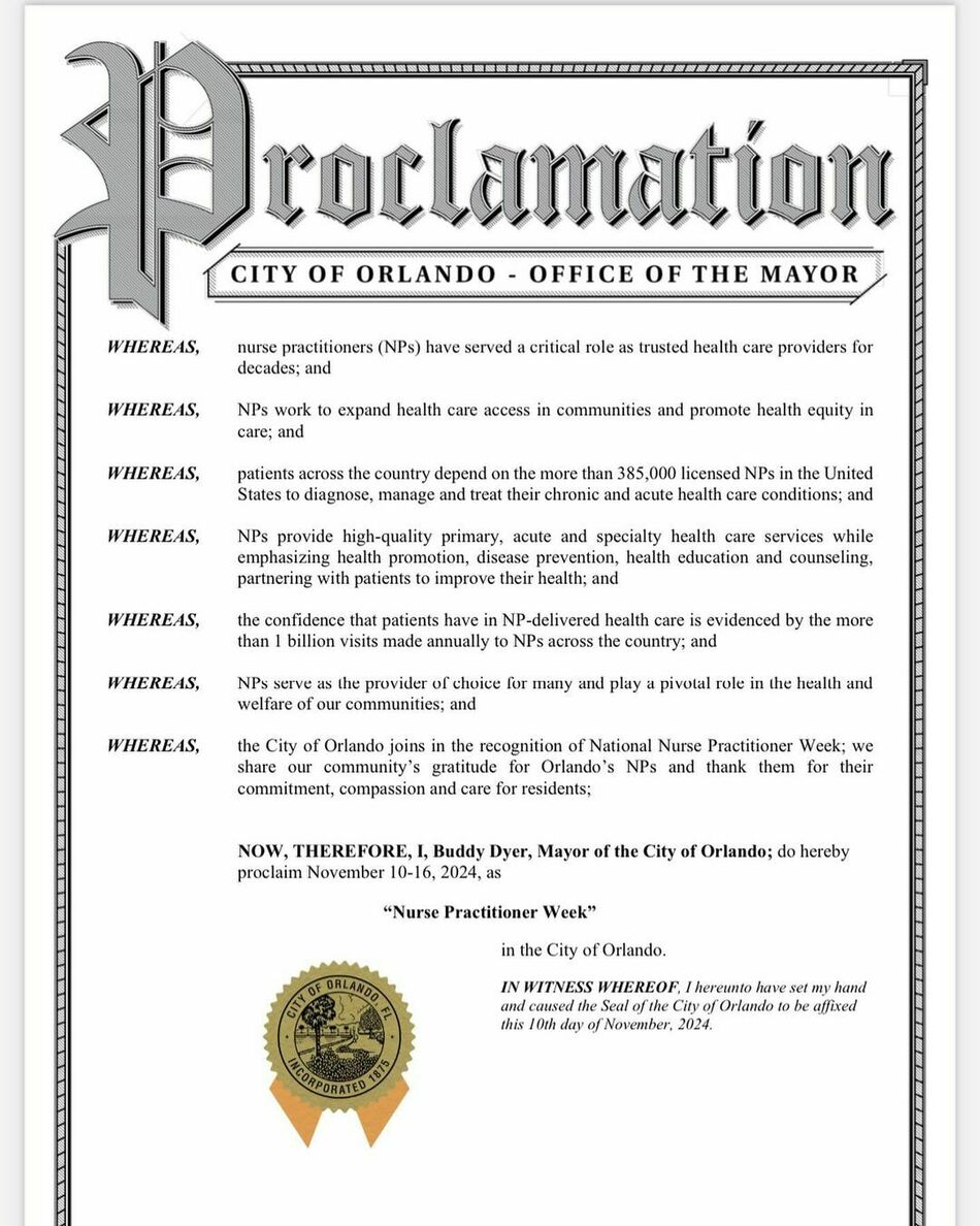 November 10-16 is officially Nurse Practitioner Week in Orlando, FL, and we couldn't be more honored to be recognized for the dedication, advocacy, and hard work we put into caring for our community.